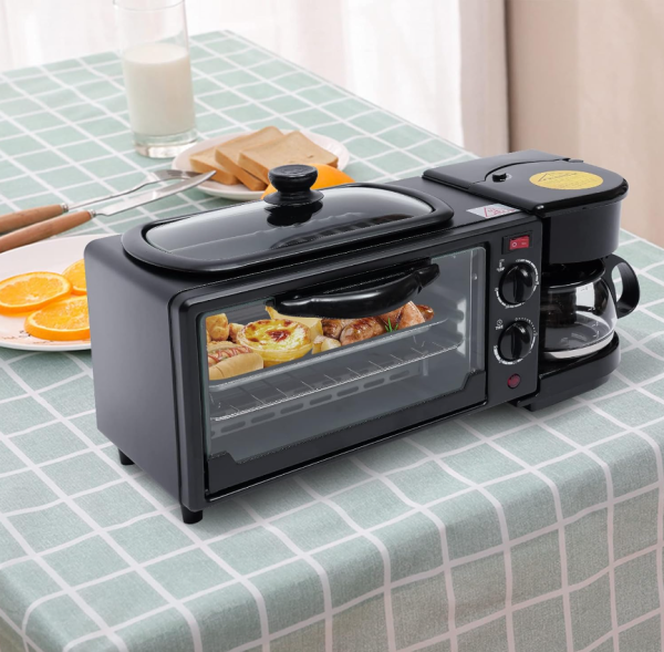 - Coffee Maker: Brew up to 4 cups of coffee while preparing breakfast. The coffee pot comes with a glass carafe and a warming plate.