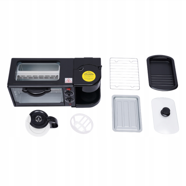 - Accessories: 1x bake tray, 1x grill tray, 1x grill pan, 1x coffee pot, 1x user manual in English
